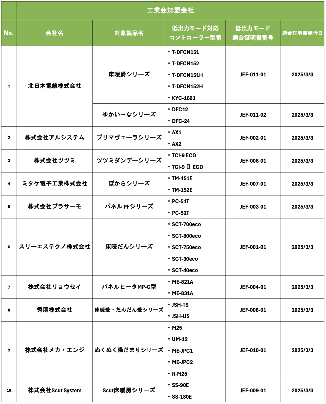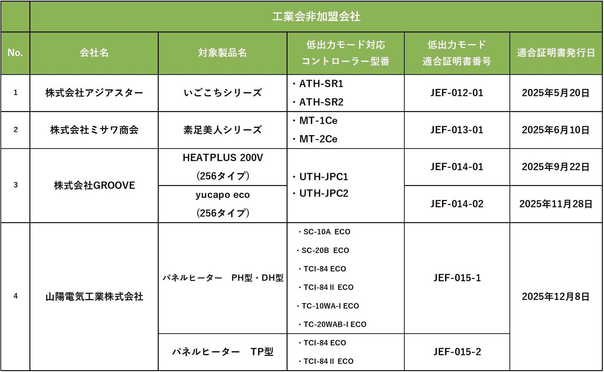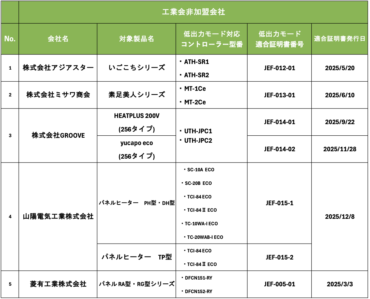 ZEHおよび省エネ基準適合機器一覧表 低出力セーブ/エコ・モード対応